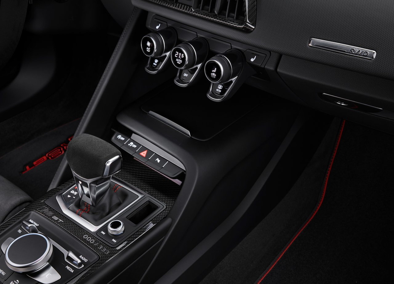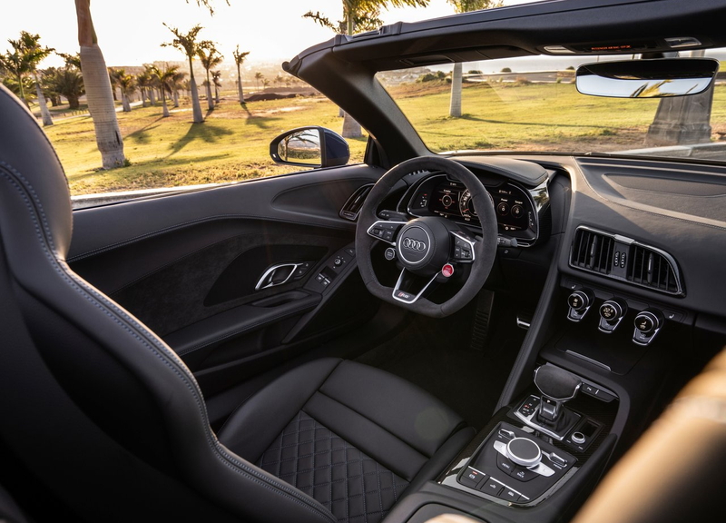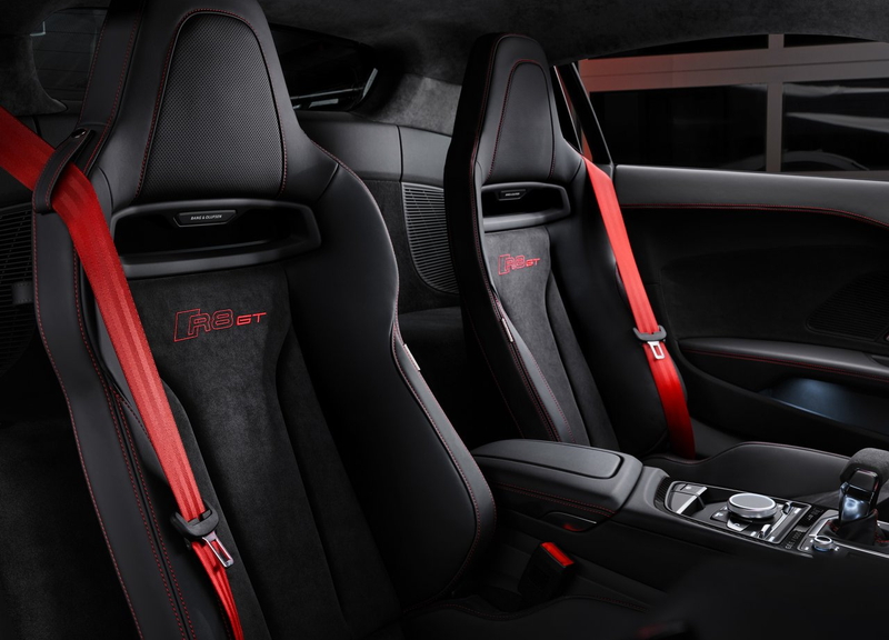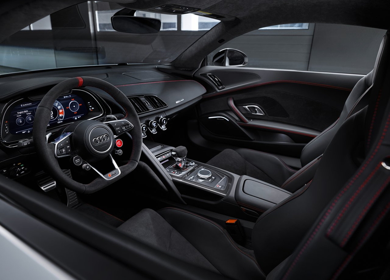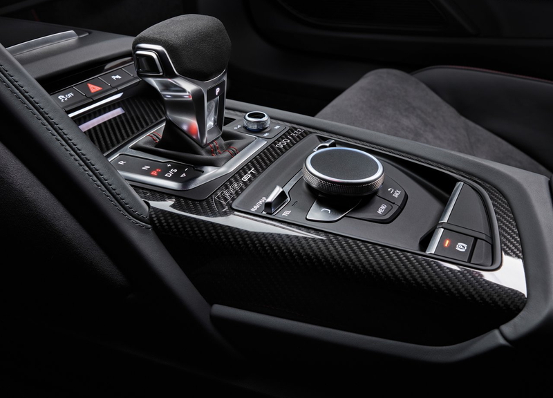 R8のキャビンは徹底してドライバーを中心に設計されています。操作系はすべて運転席から手が届く位置に配置され、レーシングカーに近い一体感を演出。センターコンソールはシンプルにまとめられ、余計な要素を排除することで走りへの集中を妨げません。