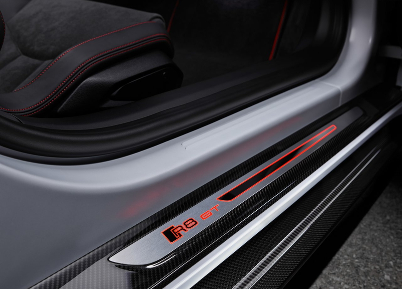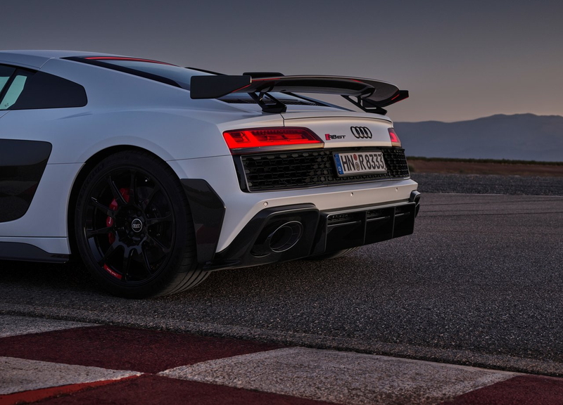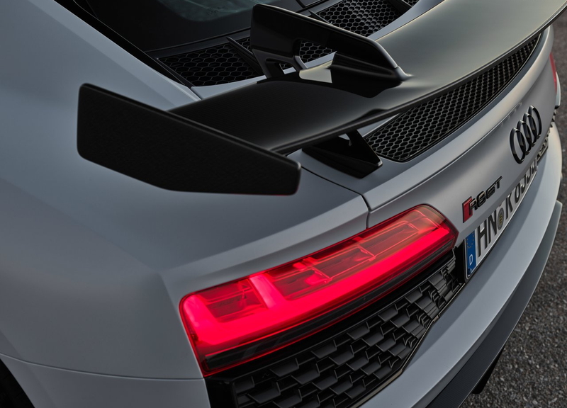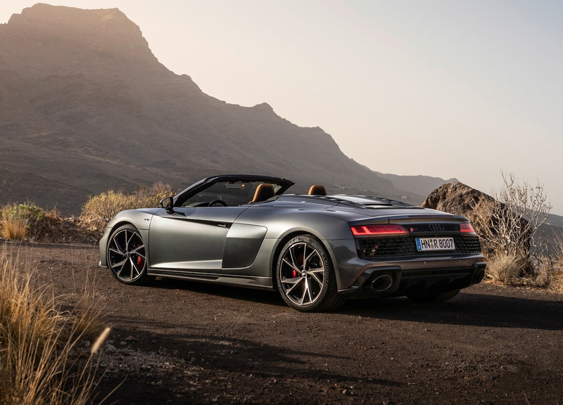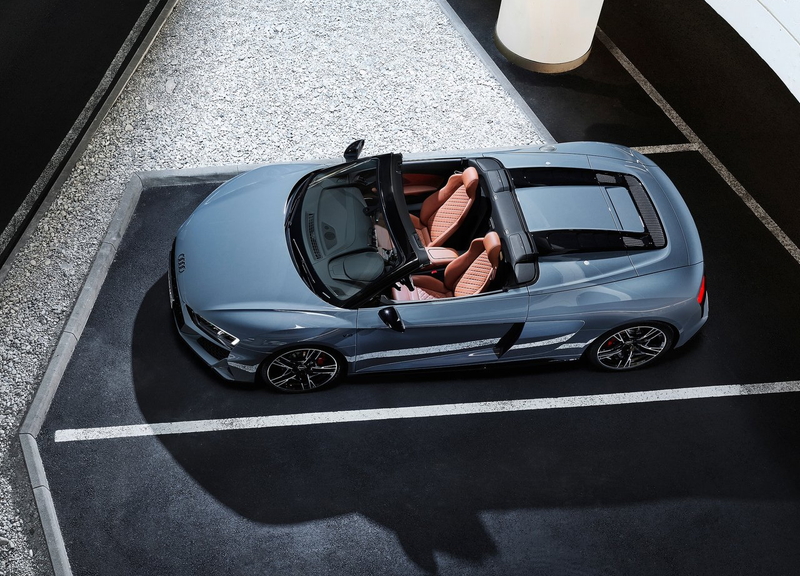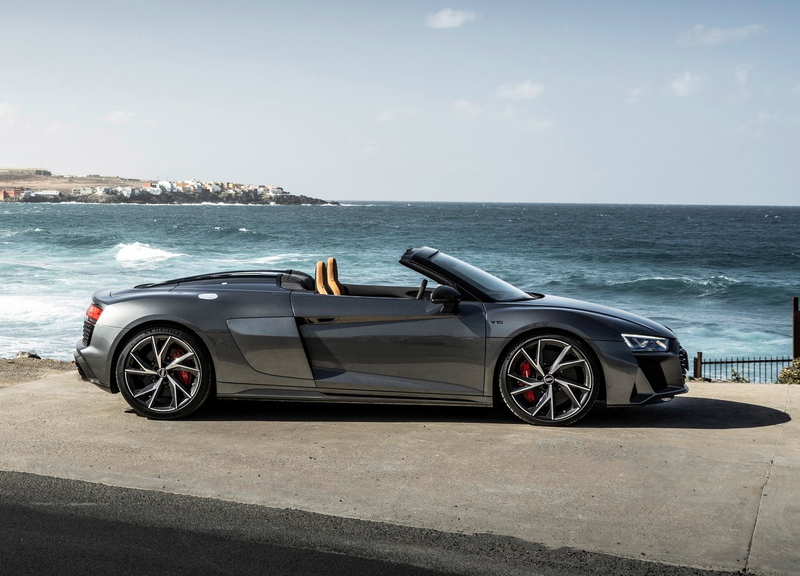 サイドビューでは、R8の象徴ともいえる**「サイドブレード」**が目を引きます。これはエンジンの冷却効率を高める機能部品でありながら、デザイン面でも強烈なアイデンティティを与えています。ルーフラインはなだらかに流れ、クーペらしい美しいシルエットを描きます。ホイールは19インチまたは20インチが設定され、軽量アルミ製のスポークデザインが高性能を視覚的に表現しています。