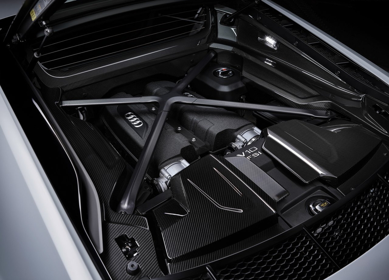 現行R8に搭載されるのは、5.2リッターV型10気筒自然吸気エンジン。ターボ過給を用いず高回転まで一気に吹け上がる特性が魅力で、スロットルレスポンスは鋭く、官能的なサウンドを奏でます。